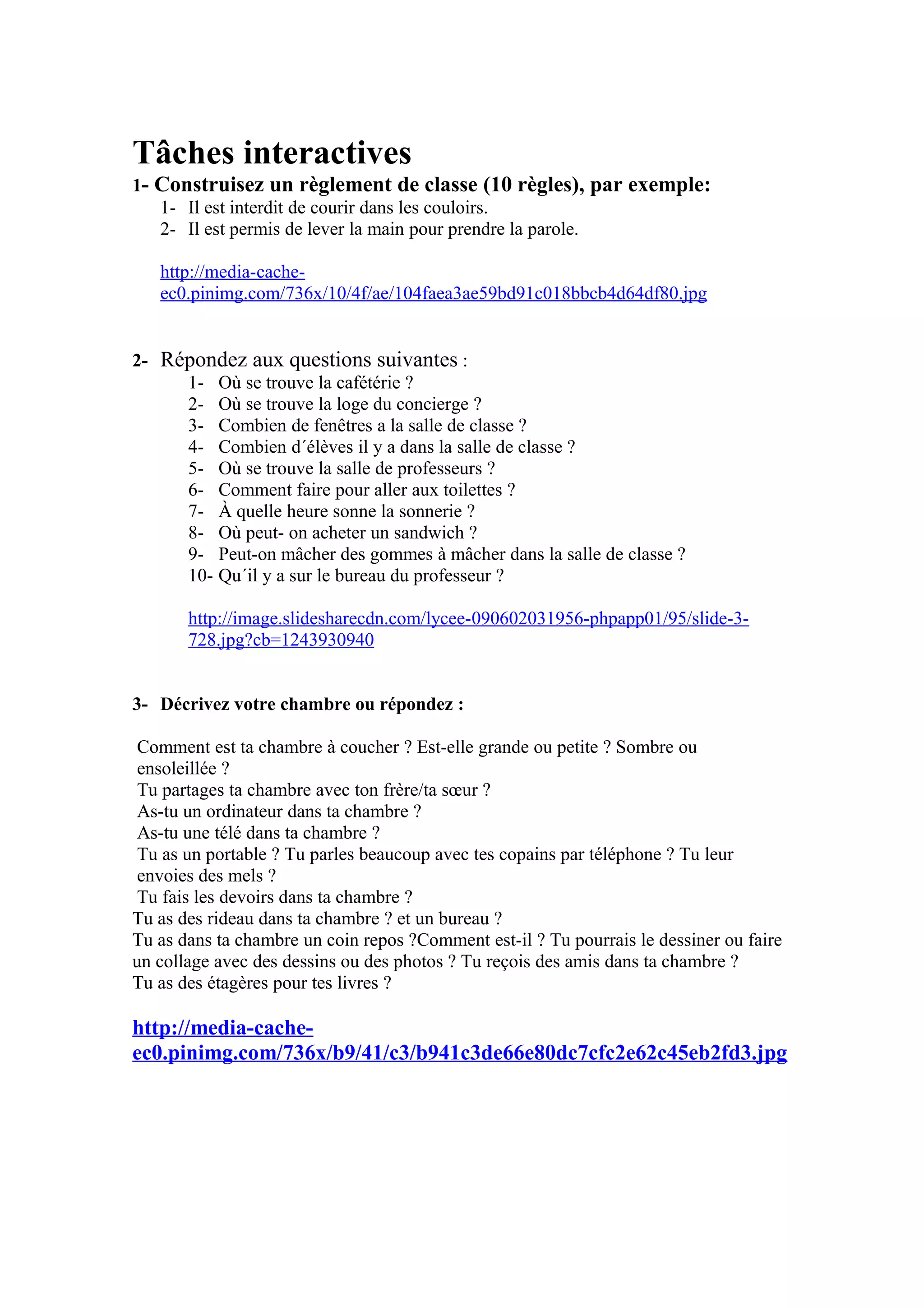 Le document présente une série d'activités interactives, notamment la création de règles de classe, des questions sur l'environnement scolaire, la description de la chambre personnelle, et l'écriture de lettres à des correspondants. Il couvre également des sujets variés tels que la nutrition, la vie saine, et les horaires des repas dans différentes cultures. Les activités encouragent la créativité et la réflexion personnelle des élèves.