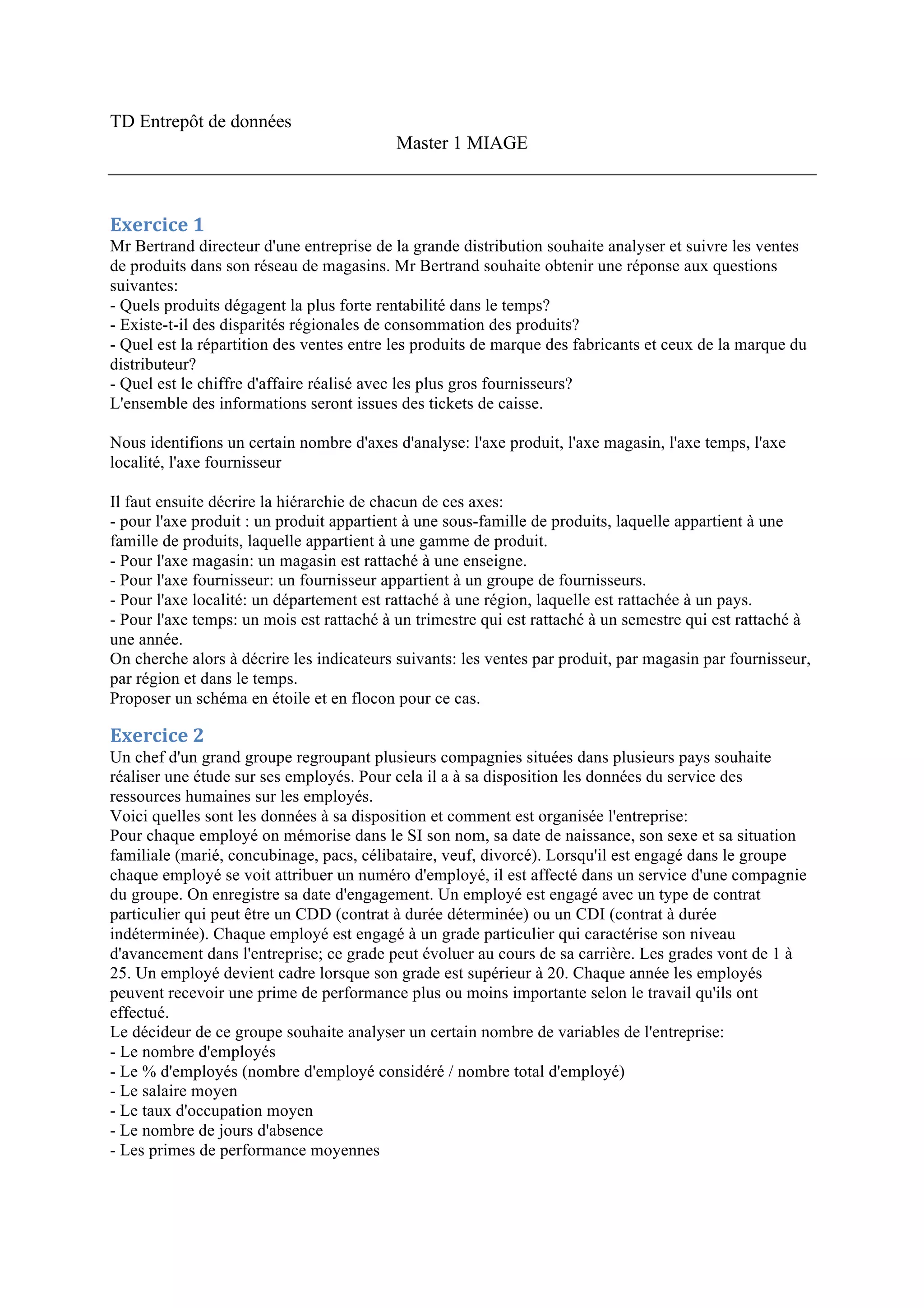 Le document présente plusieurs exercices relatifs à l'analyse des données pour divers contextes d'entreprise, notamment la vente au détail, la gestion des employés et des polices d'assurance. Chaque exercice souligne l'importance de l'entrepôt de données dans l'analyse des ventes, de la performance des employés et de la gestion des sinistres, en proposant des approches pour la modélisation des données et des indicateurs essentiels. Enfin, des questions sont posées pour guider l'implémentation des entrepôts de données et l'analyse des informations récoltées.