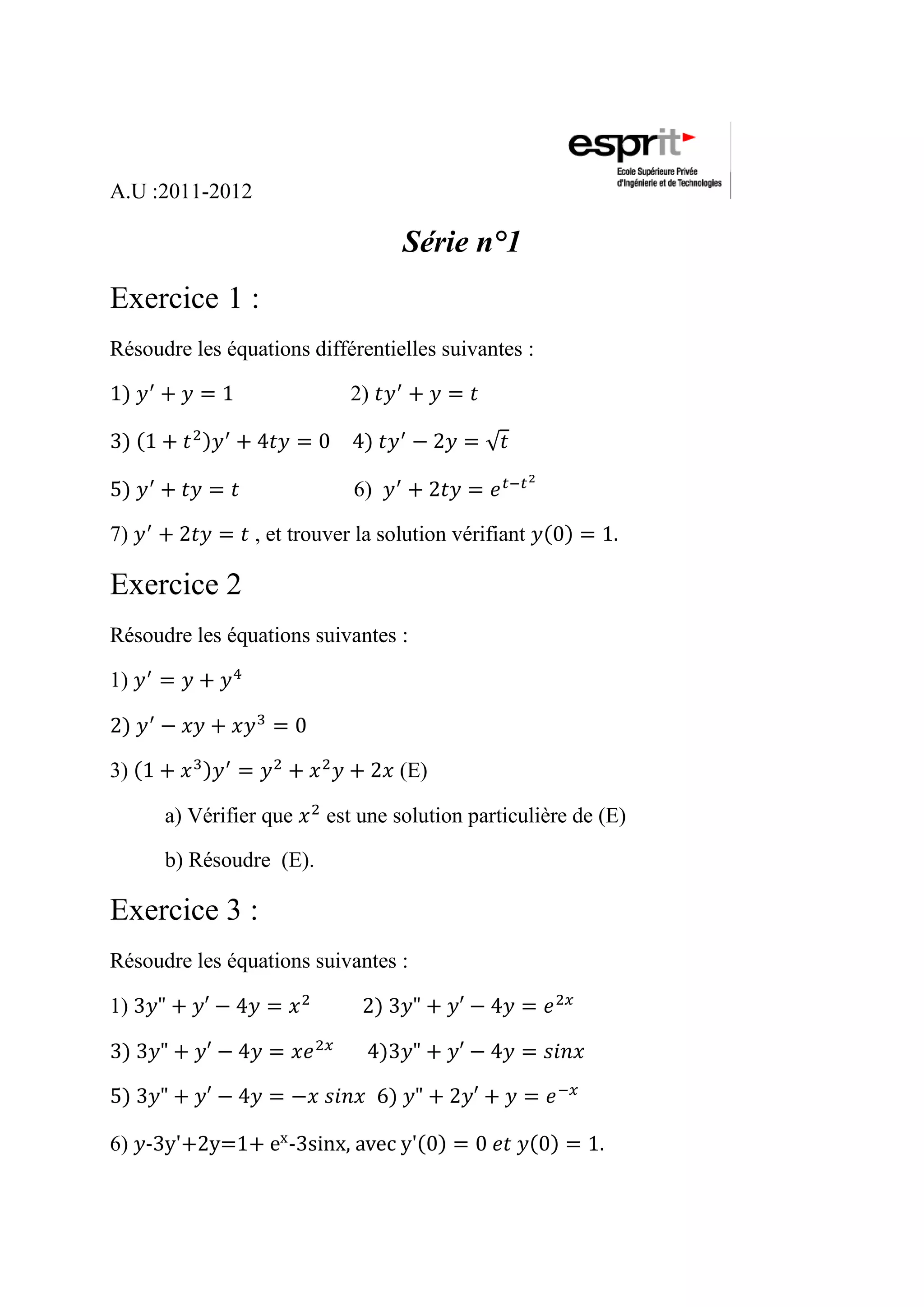 Le document se compose d'exercices sur la résolution d'équations différentielles. Les exercices incluent des instructions pour vérifier des solutions particulières et résoudre différentes équations. Il présente au moins trois exercices distincts avec des sous-questions.