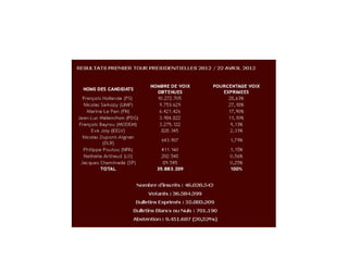 Le document présente les résultats du premier tour des élections présidentielles de 2012 en France avec le nombre de voix et le pourcentage de voix exprimées pour chaque candidat. François Hollande a obtenu le plus de voix avec 28,63 %, suivi de Nicolas Sarkozy avec 27,18 %. Une erreur de calcul sur le taux d'abstention est notée, indiquant un chiffre incorrect de 9 451 687 au lieu du correct 9 444 143.