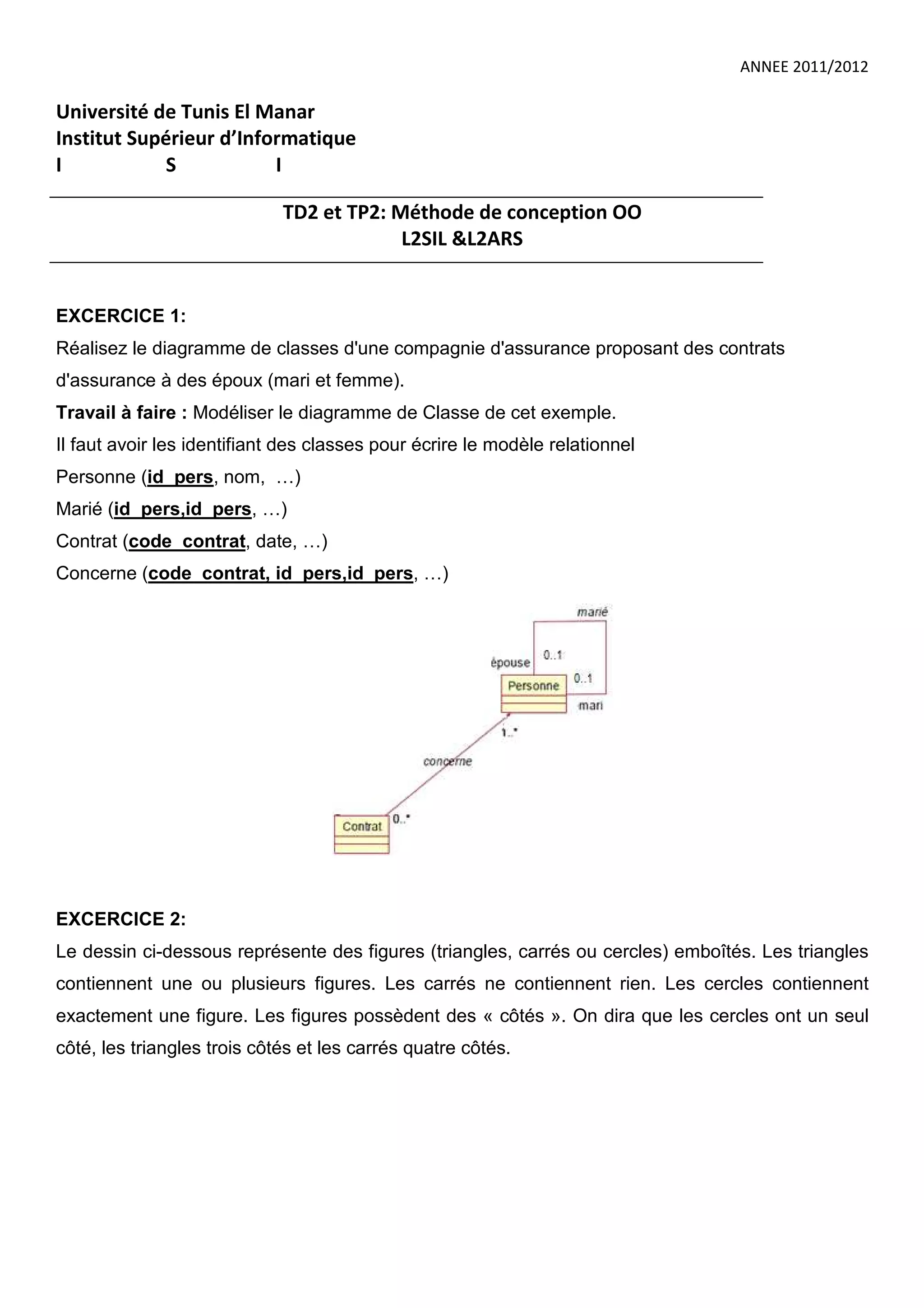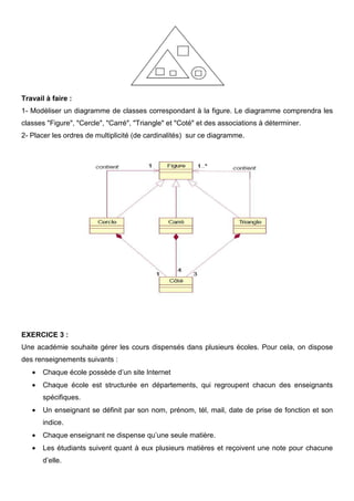 Le document présente une série d'exercices de modélisation de diagrammes de classes pour des scénarios variés, tels qu'une compagnie d'assurance, des académies scolaires, et une société de fabrication de composants de moteurs. Chaque exercice inclut des descriptions détaillées des entités, attributs et relations à modéliser. Les étudiants sont invités à créer des diagrammes de classes et à définir des cardinalités pour représenter les structures proposées.