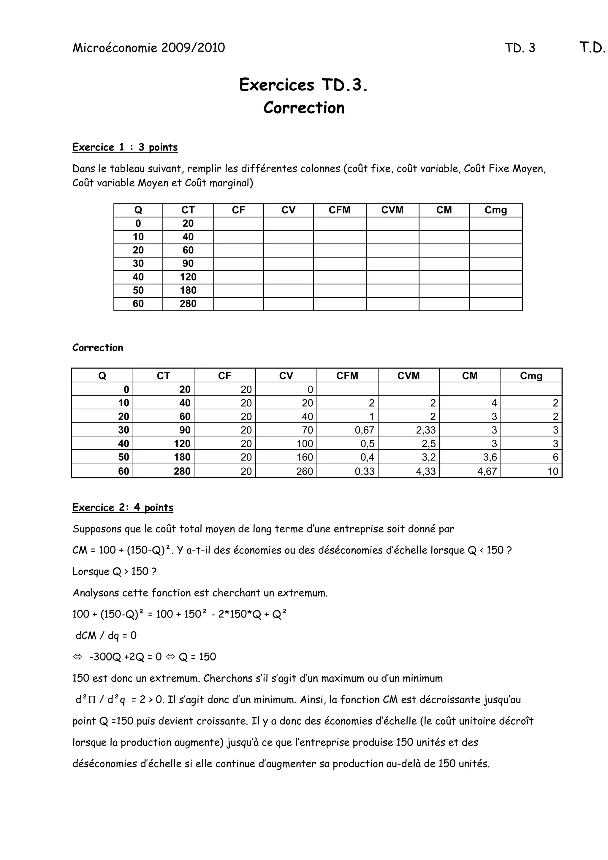 Le document traite d'exercices de microéconomie impliquant des calculs de coûts fixes, coûts variables, et économies d'échelle. Il explore les conditions de maximisation du profit pour une entreprise en concurrence parfaite, en calculant les profits à différents niveaux de prix et en analysant les fonctions de coût. Des exemples permettent d'étudier les coûts de production de fromagers et la quantité optimum à produire selon le prix du marché.