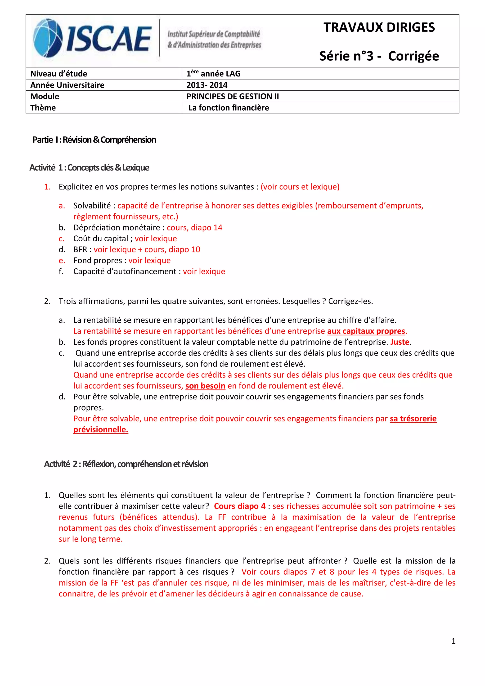 Ce document traite des concepts financiers fondamentaux, tels que la solvabilité, la rentabilité, les risques financiers et l'importance de la fonction financière dans la maximisation de la valeur d'une entreprise. Il propose également des exercices pratiques sur l'actualisation et la capitalisation des flux monétaires, ainsi que des études de cas sur des projets d'investissement afin d'évaluer leur viabilité. Les résultats montrent l'impact de l'endettement et des choix d'investissement sur la rentabilité et les risques associés.