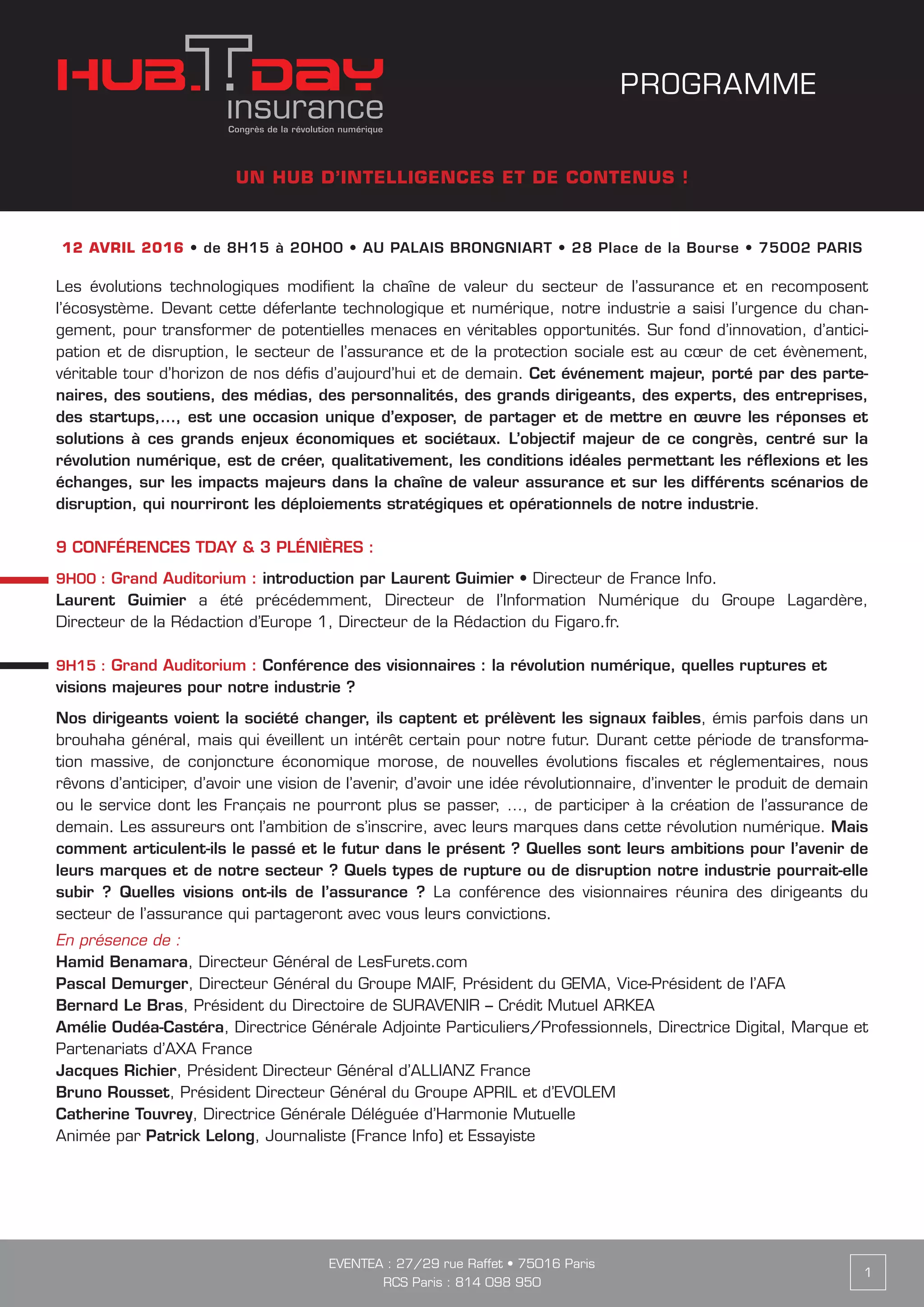 Cet événement au Palais Brongniart aborde les transformations technologiques dans le secteur de l'assurance, mettant en avant des conférences sur la disruption numérique et ses implications pour la relation client. Des experts et dirigeants du secteur partageront leurs visions sur l'avenir de l'assurance face à ces évolutions, notamment par l'intégration des objets connectés et l'usage des données de santé. L'objectif est de créer un cadre de réflexion pour anticiper les impacts majeurs du numérique sur la chaîne de valeur de l'assurance.
