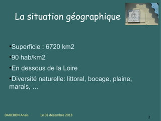 La Vendée est une région située au bord de la mer, caractérisée par sa diversité naturelle et une population de 90 habitants par km². Elle est connue pour ses activités telles que le Vendée Globe et le Parc du Puy du Fou, qui propose des spectacles variés pour toute la famille. Avec 250 km de côte, elle offre également des opportunités de loisirs comme la baignade et la pêche.