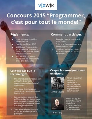 Le concours 'Programming is for Everyone' 2015 invite les enseignants et les élèves du Nouveau-Brunswick à participer entre le 1er décembre et le 31 janvier. Les enseignants peuvent gagner 1000 $ tandis que 5 élèves avec les applications les plus suivies se partageront 500 $. Le concours encourage la création d'applications sur diverses thématiques avec un accent sur les solutions innovantes à des problèmes réels.