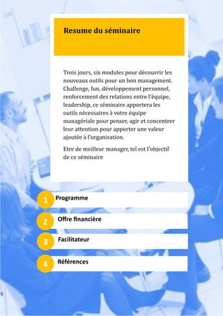 Le séminaire de team building dirigé par Rovaniaina Ramarojaona, d'une durée de trois jours, vise à fournir aux managers des outils essentiels pour un bon management à travers six modules. Le thème 'mission Apollo' illustre les défis rencontrés par la NASA, reflétant les problèmes actuels des organisations modernes, tout en abordant des sujets comme la communication, la motivation et l'innovation. À la fin du séminaire, les participants auront amélioré leurs compétences en gestion d'équipe et en évaluation de la performance, formant ainsi une base solide pour un management efficace.