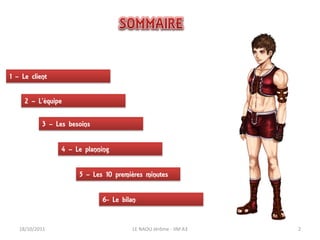 Le document présente le projet de création d'un jeu de combat en ligne innovant pour le client Chapatiz, visant à attirer une clientèle âgée de 15 à 25 ans. Il décrit le planning, l'équipe de projet, ainsi que les différentes fonctionnalités du jeu, notamment l'inscription, le matchmaking et la boutique. En outre, l'auteur partage les connaissances acquises à travers ce projet, telles que la gestion d'une équipe et la communication avec un client.
