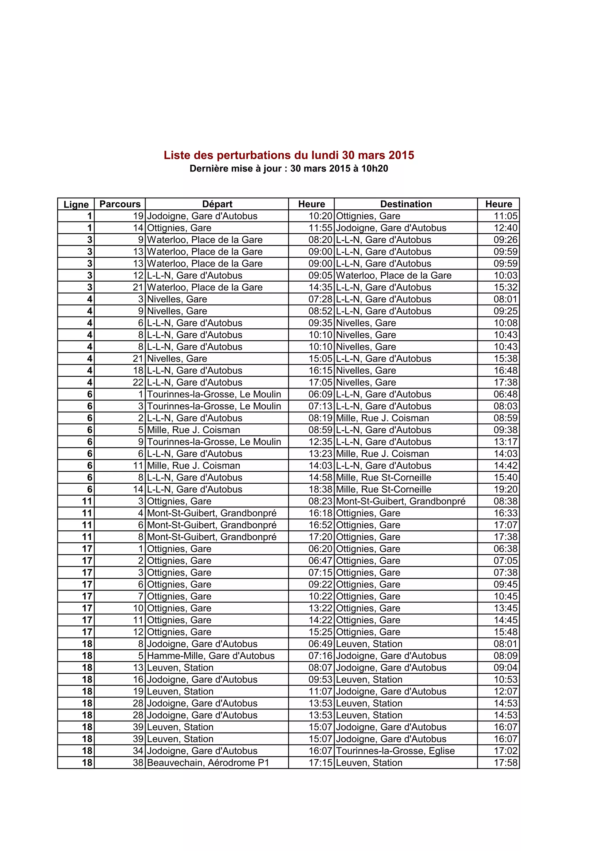 Le document présente un horaire de transport en commun, détaillant les trajets entre différentes gares et arrêts d'autobus. Chaque ligne indique les horaires de départ et d'arrivée pour plusieurs destinations. Les informations incluent également des perturbations récentes dans le service.