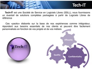 Tech-it est une société de services spécialisée dans les logiciels libres, offrant des solutions personnalisées pour la gestion de projets, l'intégration de systèmes et le développement de logiciels. Elle propose divers outils open source tels qu'Openerp pour la gestion d'entreprise, Alfresco pour la gestion de contenu, et SugarCRM pour le CRM, visant à optimiser la productivité et la gestion documentaire. En outre, Tech-it fournit des services variés tels que la formation en ligne, le développement web et le support technique, tout en s'engageant à répondre aux besoins spécifiques de ses clients.