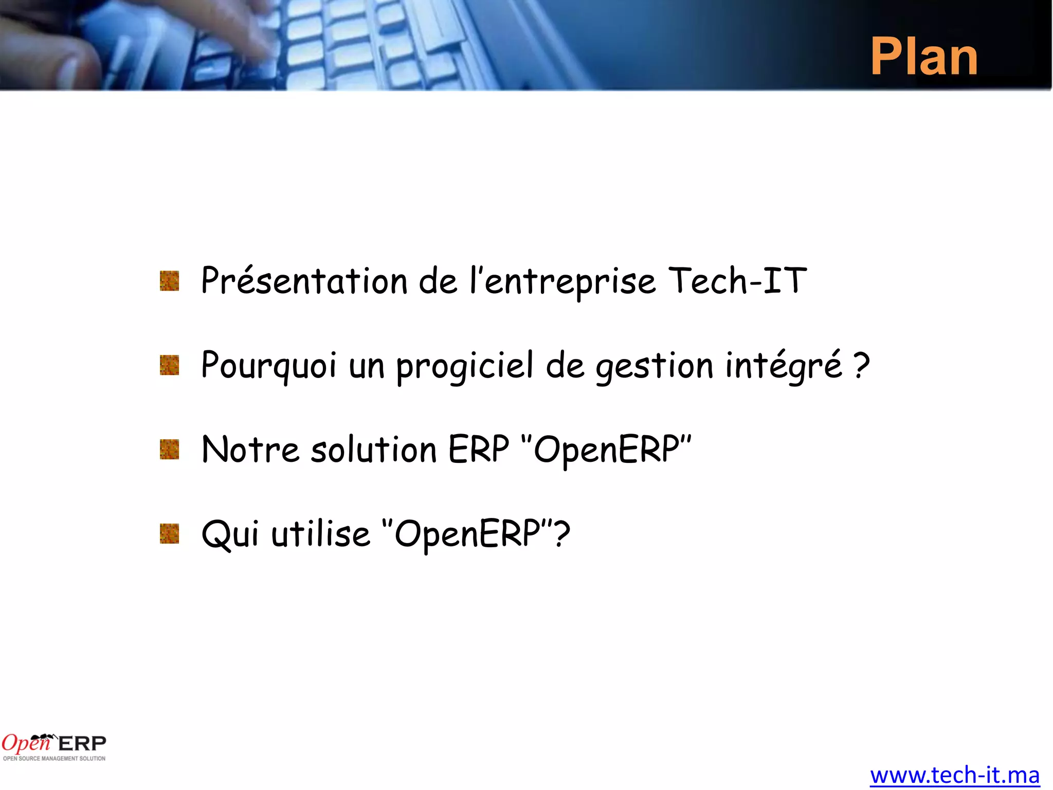 Tech-it est une société de services en logiciels libres proposant des solutions ERP basées sur OpenERP, visant à intégrer les processus d'affaires et à améliorer la communication au sein des départements. Leur offre inclut des services tels que la gestion de projets, la migration de données, et diverses formations pour utilisateurs et développeurs. L'ERP permet une gestion modulaire et personnalisable, adaptée aux besoins spécifiques des clients dans divers secteurs d'activité.