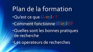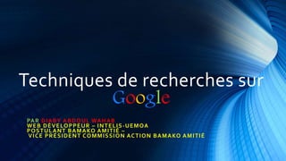Le document présente une analyse des techniques de recherche sur Google, détaillant son fonctionnement, les bonnes pratiques de recherche et les opérateurs de recherche. Google, fondé en 1998, est un moteur de recherche dominant qui organisationne l'information à l'échelle mondiale. Les utilisateurs peuvent optimiser leurs recherches en utilisant des conseils pratiques et en comprenant les critères d'indexation de Google.