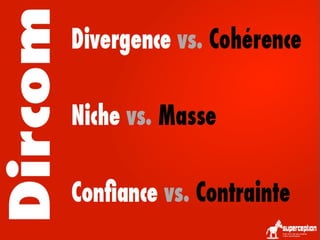Le laboratoire d’idées labcom est un lieu de rencontre pour les professionnels de la communication et du digital, proposant des conférences sur des thématiques innovantes. Les tendances pour 2014 incluent la digital detox, le web émotionnel et l'importance des données personnelles dans le marketing. Les discussions portent également sur la nécessité d'établir un équilibre entre connexion numérique et bien-être personnel.