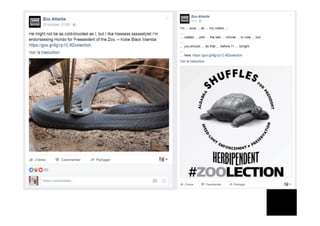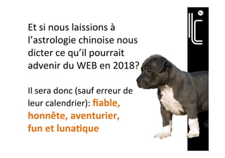 Le document aborde les tendances du community management et du design web pour 2018, en s'inspirant de l'astrologie chinoise. Il met en avant des caractéristiques clés telles que la fiabilité, l'honnêteté, l'audace et le fun, tout en soulignant l'importance de l'innovation et de l'esthétique visuelle dans la création de contenu. Plusieurs stratégies et éléments stylistiques sont présentés, tels que l'utilisation de couleurs vives, l'ergonomie responsive et l'importance de la narration visuelle.