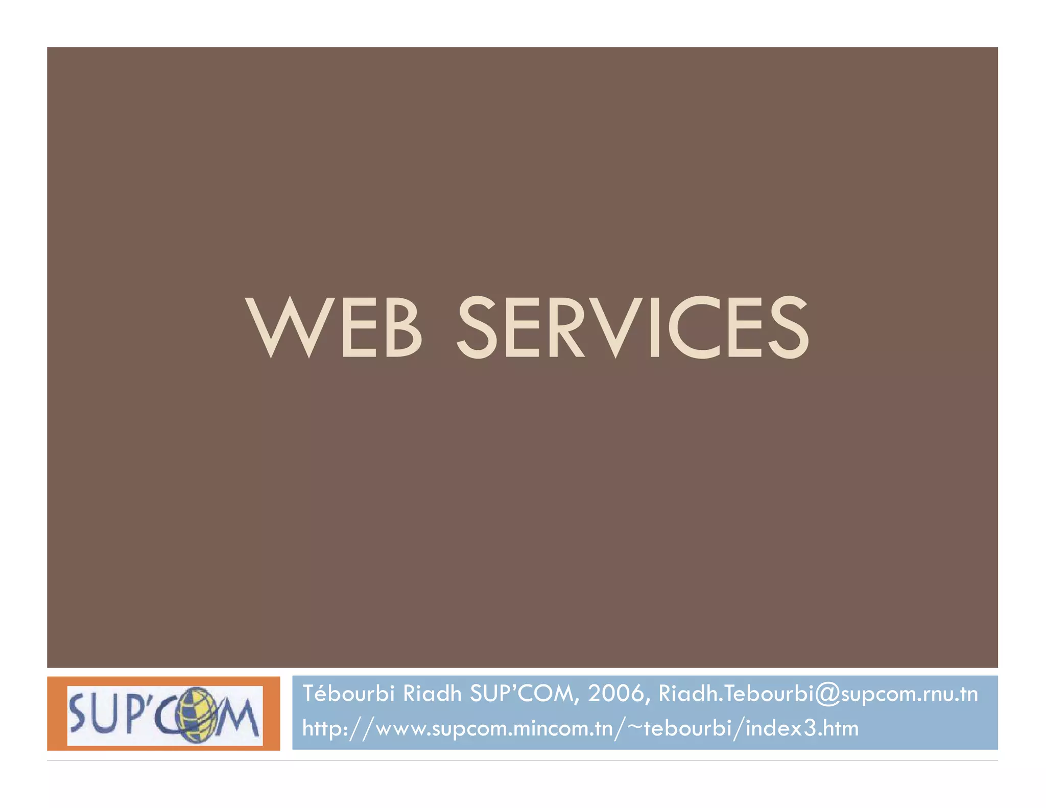 Le document décrit les web services, qui sont des protocoles permettant la communication entre des programmes sur différentes machines et écrits dans divers langages. Il explique le fonctionnement des web services à travers des technologies comme SOAP, WSDL et UDDI, ainsi que leur mise en œuvre via des exemples concrets. Enfin, il couvre les étapes de création et de test d'un service web, en utilisant Java comme exemple de développement.