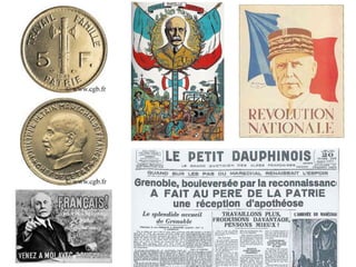 Le document analyse le régime de Vichy comme une négation de la République française, né de la défaite de juin 1940. Il présente l'instauration d'un régime autoritaire par le maréchal Pétain, articulé autour de la loi constitutionnelle du 10 juillet 1940, qui vise à régénérer la nation sous le slogan 'travail, famille, patrie'. Enfin, il évoque les crimes associés à ce régime.