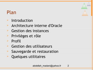 Le document présente une synthèse complète de l'architecture interne d'Oracle, incluant la gestion des instances, des privilèges, et l'organisation des données, mémoires et processus. Il aborde aussi les fichiers essentiels comme les data files, redo log files et control files, ainsi que les processus principaux tels que dbwr, lgwr, smon et pmon. Enfin, il décrit les structures logiques et physiques d'une base de données Oracle ainsi que les outils de gestion disponibles.