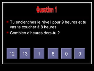 Le document présente une série de questions de logique et de calcul, avec les bonnes réponses fournies après chaque question. Il aborde des concepts simples comme le calcul des heures de sommeil et des mathématiques de base. Les questions incluent également des énigmes, soulignant des réponses souvent inattendues.