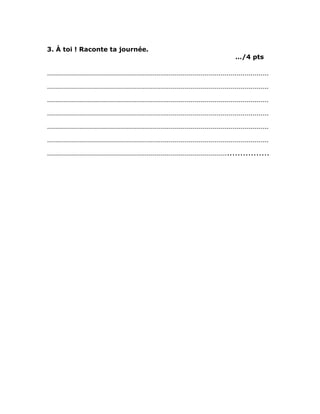 Le document présente une série de contrôles pour un cours de français appelé 'copains copines'. Chaque contrôle évalue les compétences des élèves à travers des exercices tels que compléter des phrases, écrire des réponses, dessiner ou relier des concepts. Les thèmes abordés comprennent la routine quotidienne, les activités, et la description des personnages et des objets.