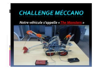 Le projet 'The Monsters' implique la construction d'un véhicule par l'équipe dirigée par Danny et Aurélien, avec l'aide de Benoit pour le diaporama. Un problème de frottement a été résolu grâce à un système poulie/courroie. L'équipe aspire à en apprendre davantage sur la robotique et envisage une carrière en ingénierie des matériaux.