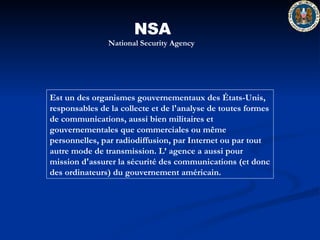 La NSA (National Security Agency) est une agence gouvernementale américaine responsable de la collecte et de l'analyse des communications, tant militaires que civiles. Elle a été fondée à l'issue de la Seconde Guerre mondiale et est reconnue pour son rôle discret dans le renseignement mondial, notamment à travers le système Echelon. La NSA, avec le plus grand budget et le plus gros effectif de mathématiciens, utilise des technologies avancées pour surveiller les communications à l'échelle mondiale.