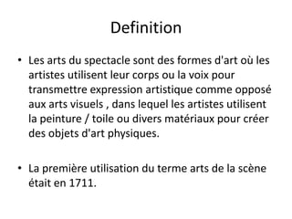 Les arts du spectacle utilisent le corps ou la voix pour exprimer des émotions, contrastant avec les arts visuels. Depuis l'antiquité jusqu'à l'ère moderne, le théâtre, l'opéra et la danse ont évolué, intégrant des éléments comme l'improvisation et le cinéma, tout en reflétant les changements socioculturels. Le mouvement de performance art, qui défie les conventions traditionnelles et se concentre sur l'interaction avec le public, a également émergé comme une forme d'art significative.
