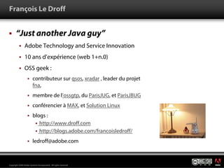 Le document discute de l'intégration des technologies Spring et Flex Remoting, en mettant en lumière la transition de l'approche Spring Factory vers Spring-Flex. Il souligne les défis de configuration et d'instanciation des objets dans l'intégration, tout en présentant des solutions potentielles pour améliorer cette interaction. Des exemples de configuration et des liens vers des ressources supplémentaires sont également fournis.