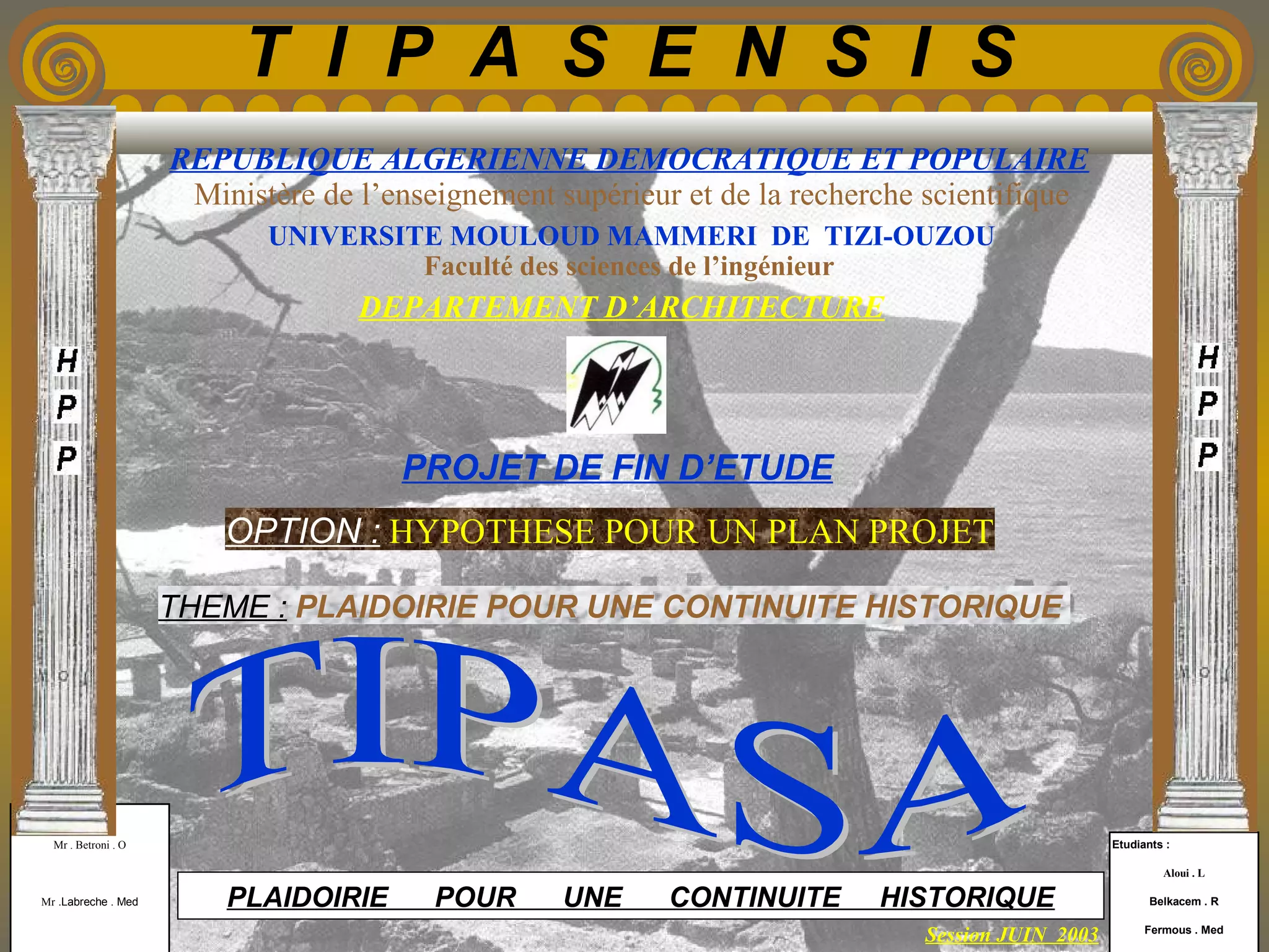 Le document présente un projet de fin d'étude sur la continuité historique à Tipasa, abordant son évolution depuis les étapes préhistoriques jusqu'à l'époque coloniale. Les étudiants, sous la direction des enseignants, explorent des approches théoriques et pratiques pour proposer des solutions urbanistiques. Cette étude vise à valoriser le patrimoine historique de la ville tout en répondant aux défis contemporains de l'urbanisme.