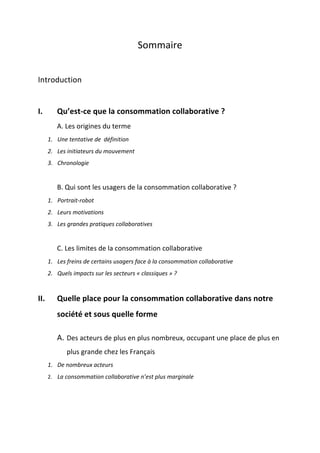 Ce document explore la consommation collaborative, un phénomène sociétal croissant, en définissant ses origines, ses usagers, et les limites qui l'entourent. Il présente également la place croissante de cette consommation dans la société française et propose une stratégie de communication pour une startup innovante dans ce domaine. Enfin, il insiste sur l'importance de modèles de business éthiques et responsables en lien avec les valeurs de partage et de confiance.