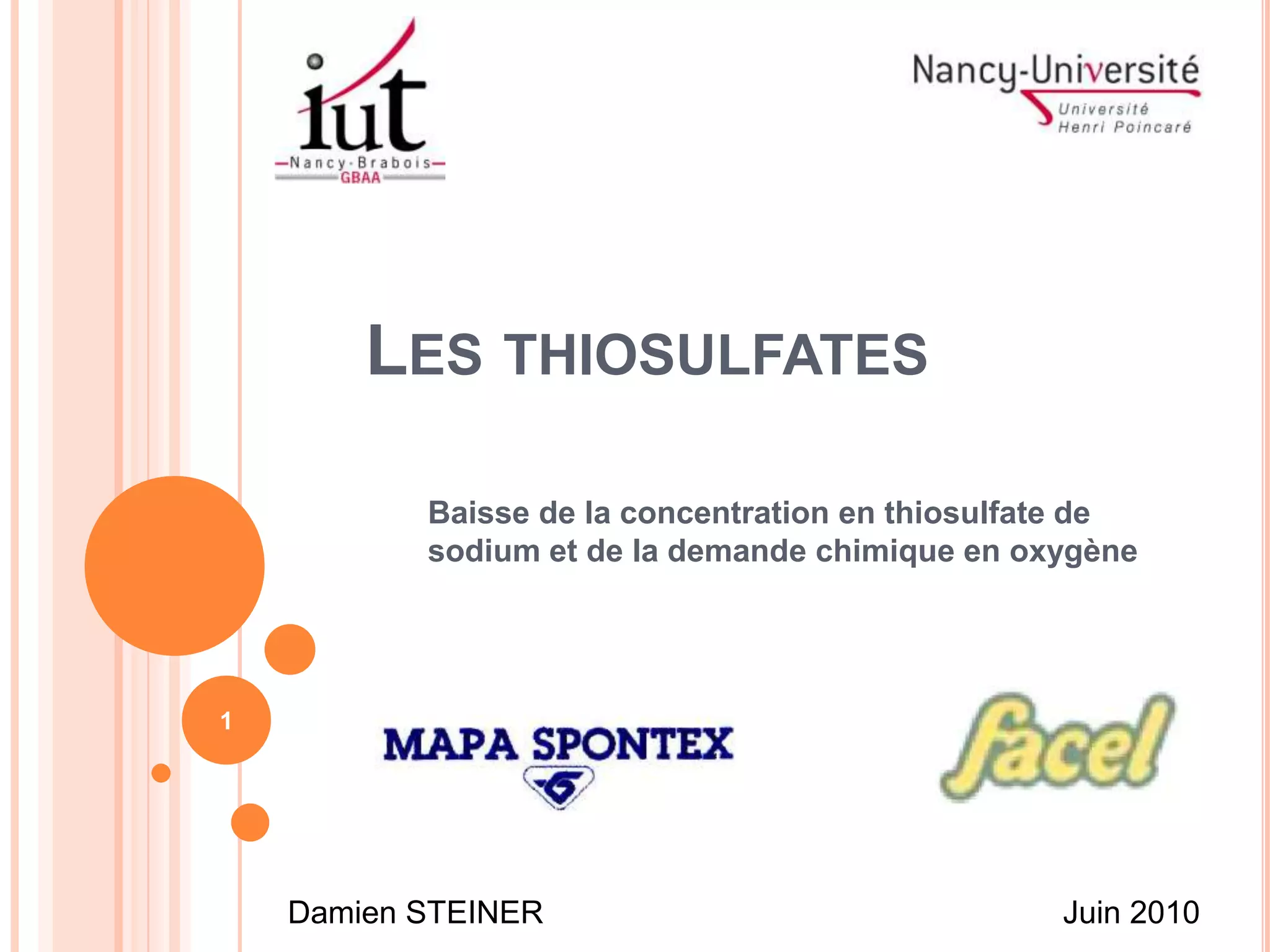 Le document présente une étude sur la réduction de la concentration en thiosulfate de sodium et la demande chimique en oxygène dans le cadre de la fabrication d'articles cellulosiques. L'analyse chimique montre que l'utilisation de charbon actif et de souches spécifiques peut améliorer la dégradation des thiosulfates. Des essais biologiques révèlent que certaines souches bactériennes sont efficaces pour éliminer le thiosulfate dans divers paramètres de culture.