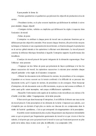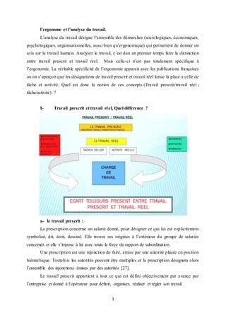 Le document traite de l'analyse du travail, en mettant l'accent sur la distinction entre travail prescrit et travail réel. Il souligne l'importance de comprendre les écarts entre ces deux concepts et les défis auxquels les travailleurs sont confrontés dans leur quotidien, notamment en raison des prescriptions souvent inadaptées. L'analyse ergonomique vise à identifier ces écarts pour améliorer la situation de travail et prévenir les risques associés.