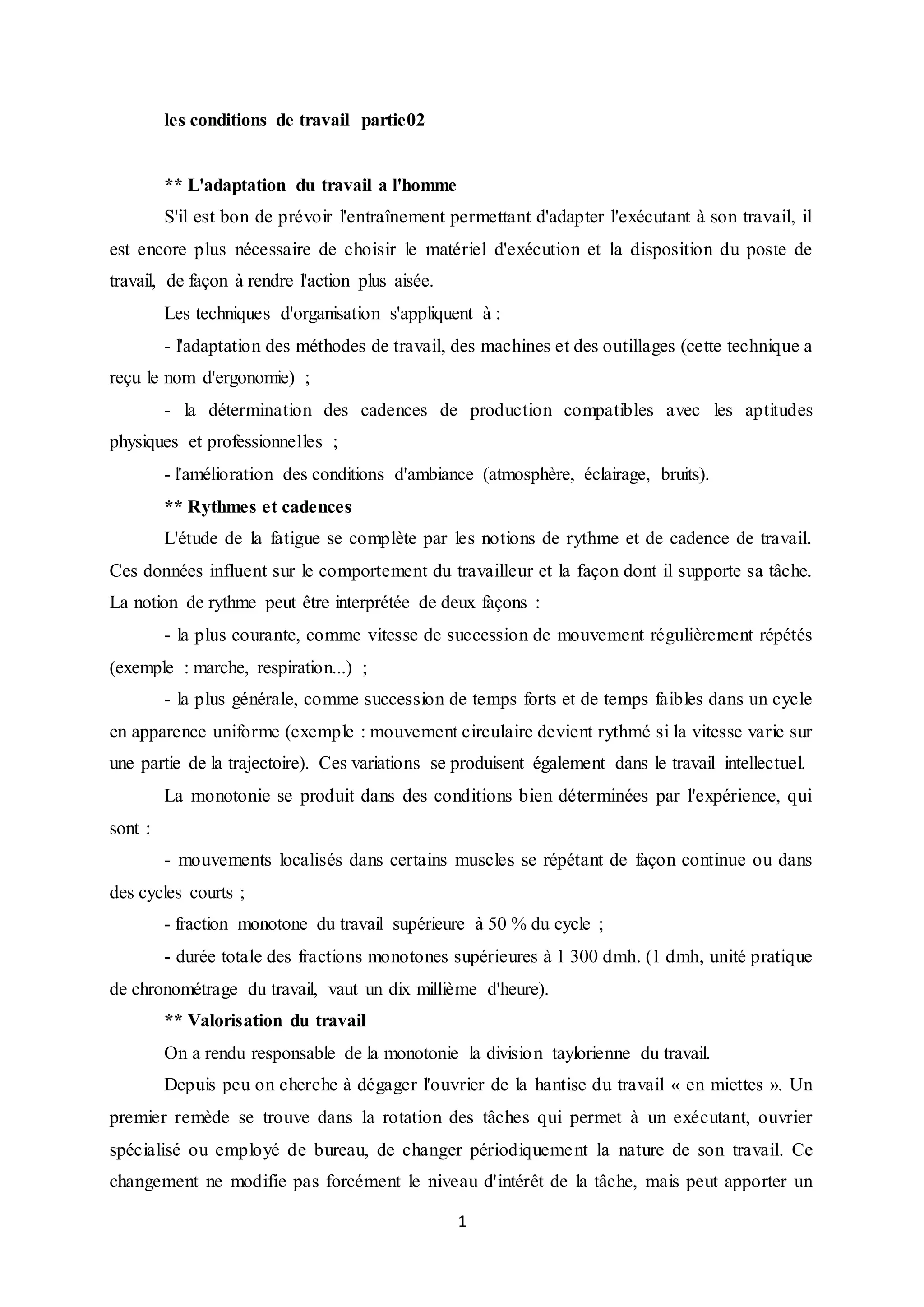 Le document traite de l'adaptation du travail à l'homme, abordant des concepts tels que l'ergonomie, la cadence de travail, l'élargissement et l'enrichissement des tâches, ainsi que l'organisation d'équipes autonomes. Il souligne l'importance de l'analyse des conditions de travail pour améliorer la productivité et le bien-être des travailleurs, en intégrant des méthodes de diagnostic et de régulation. Enfin, il évoque l'impact du progrès technologique sur la simplification des tâches et l'importance de la formation pour une meilleure performance au travail.