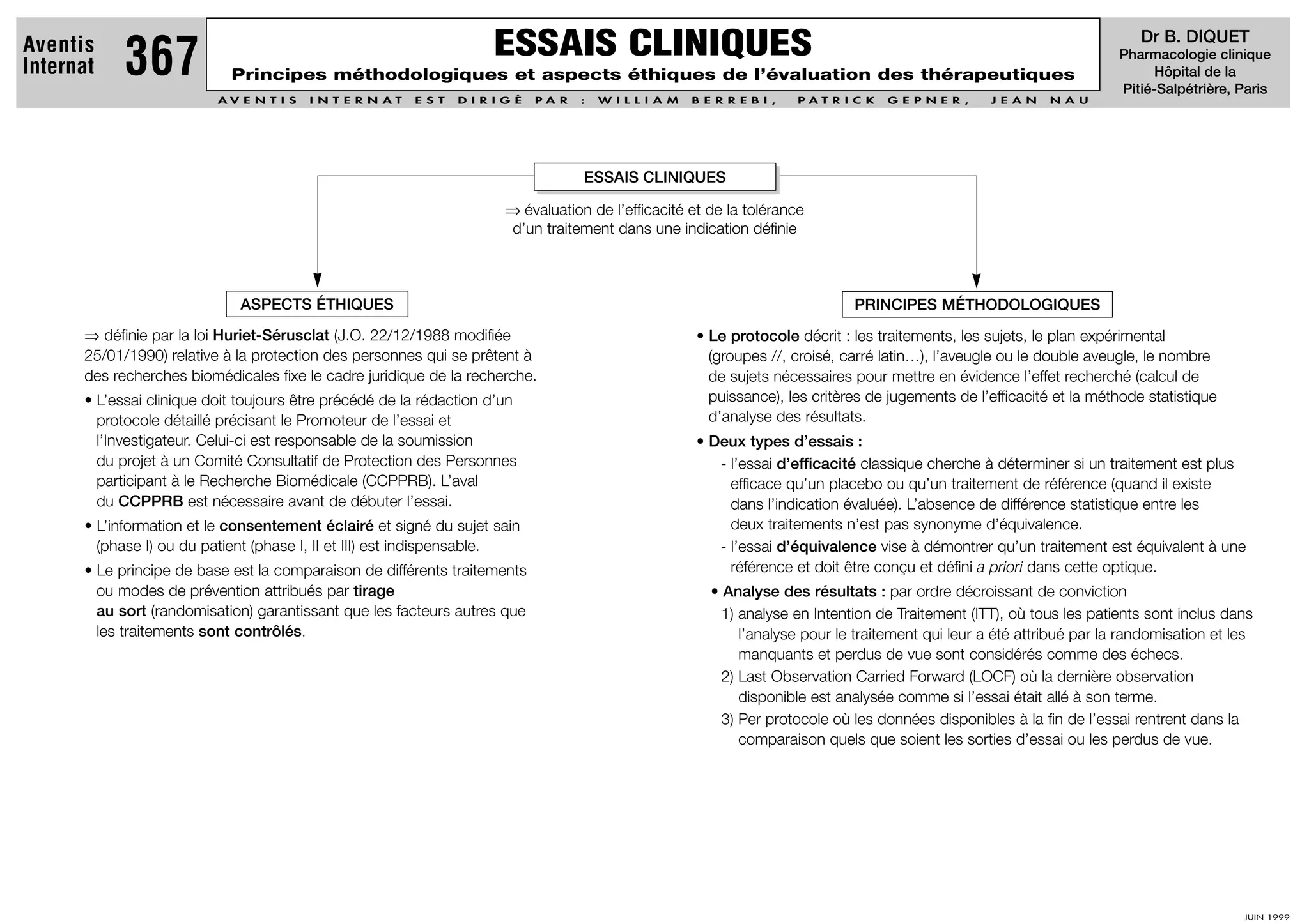 Le document traite des essais cliniques et des méthodologies éthiques nécessaires à l'évaluation des traitements médicamenteux, conformément à la loi Huriet-Sérusclat. Il souligne l'importance d'un protocole détaillé pour assurer la protection des participants, ainsi que des méthodes d'analyse appropriées pour les résultats. Des considérations pharmacologiques et iatrogéniques sont également abordées pour prévenir les effets indésirables et coder l'imputabilité des événements indésirables liés aux médicaments.