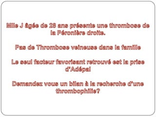 Le document aborde les investigations biologiques liées aux thrombophilies, en présentant des cas cliniques de thromboses et en discutant des facteurs de risque ainsi que des recommandations de prise en charge. Il met en évidence la distinction entre les thromboses idiopathiques et celles provoquées par des facteurs déclenchants, et souligne l'importance de l'exploration des anomalies biologiques dans certains cas. Les recommandations concernant la recherche de facteurs de risque biologique varient selon l'âge des patients et les circonstances des épisodes thromboemboliques.
