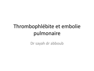 La thrombophlébite se caractérise par l'inflammation d'une veine due à un caillot sanguin, tandis que l'embolie pulmonaire résulte de la migration de ce caillot vers les artères pulmonaires, provoquant des complications graves. Les facteurs favorisants incluent la stase veineuse, les lésions pariétales et les anomalies de la coagulation. Le traitement comprend la prévention par les anticoagulants, ainsi que des soins infirmiers adaptés pour les patients atteints de ces conditions.