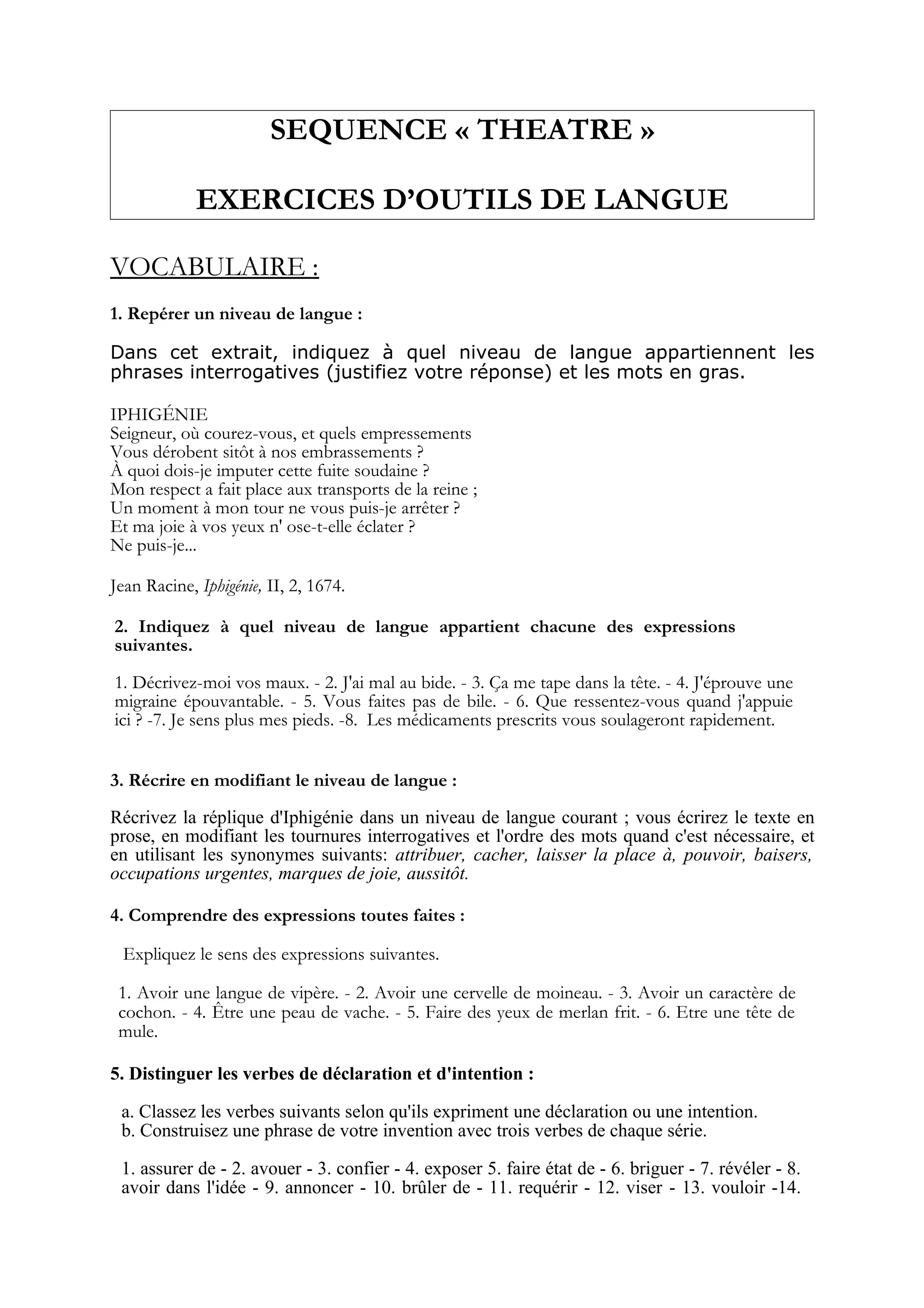 Le document propose une série d'exercices portant sur l'analyse du niveau de langue, des types de phrases, du vocabulaire lié au théâtre, et des caractéristiques grammaticales. Les activités incluent la classification des expressions selon leur registre, la transformation de phrases entre différents niveaux de langue, et l'utilisation correcte des temps et modes verbaux. Le document vise à renforcer la compréhension linguistique des étudiants à travers des exercices variés et ludiques.