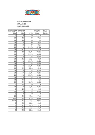 Le document présente le récapitulatif des notes de fin de semestre pour le cours de Kewirausahaan à l'université STIE-AUB Surakarta pour l'année académique 2014/2015. Il fournit des scores pour chaque étudiant, ainsi que des moyennes et des valeurs finales calculées selon divers critères de pondération. Les résultats incluent des notes brutes et finales pour chaque étudiant, avec des valeurs manquantes signalées par des zéros.