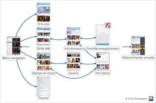 Le document est un mode d'emploi pour l'application Tivipedia v2.3, offrant des fonctionnalités telles que la navigation dans les programmes télévisés, la gestion des favoris et le contrôle d'enregistrement via Freebox. Il détaille les différentes pages, comme 'À la une', 'Programme télé', et 'Stamps', ainsi que des options de paramétrage et de télécommande. L'application déploie aussi des alertes pour les événements ou personnalités favoris détectés dans les émissions.