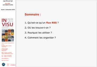 Le document présente les flux RSS, une méthode de syndication de contenu permettant un partage automatisé d'informations sur Internet. Il aborde leur définition, leur utilisation dans le domaine de l'art, ainsi que des conseils pour les organiser et les identifier. Enfin, il évoque les débats sur l'avenir des flux RSS et fournit des exemples de leur utilisation pratique.