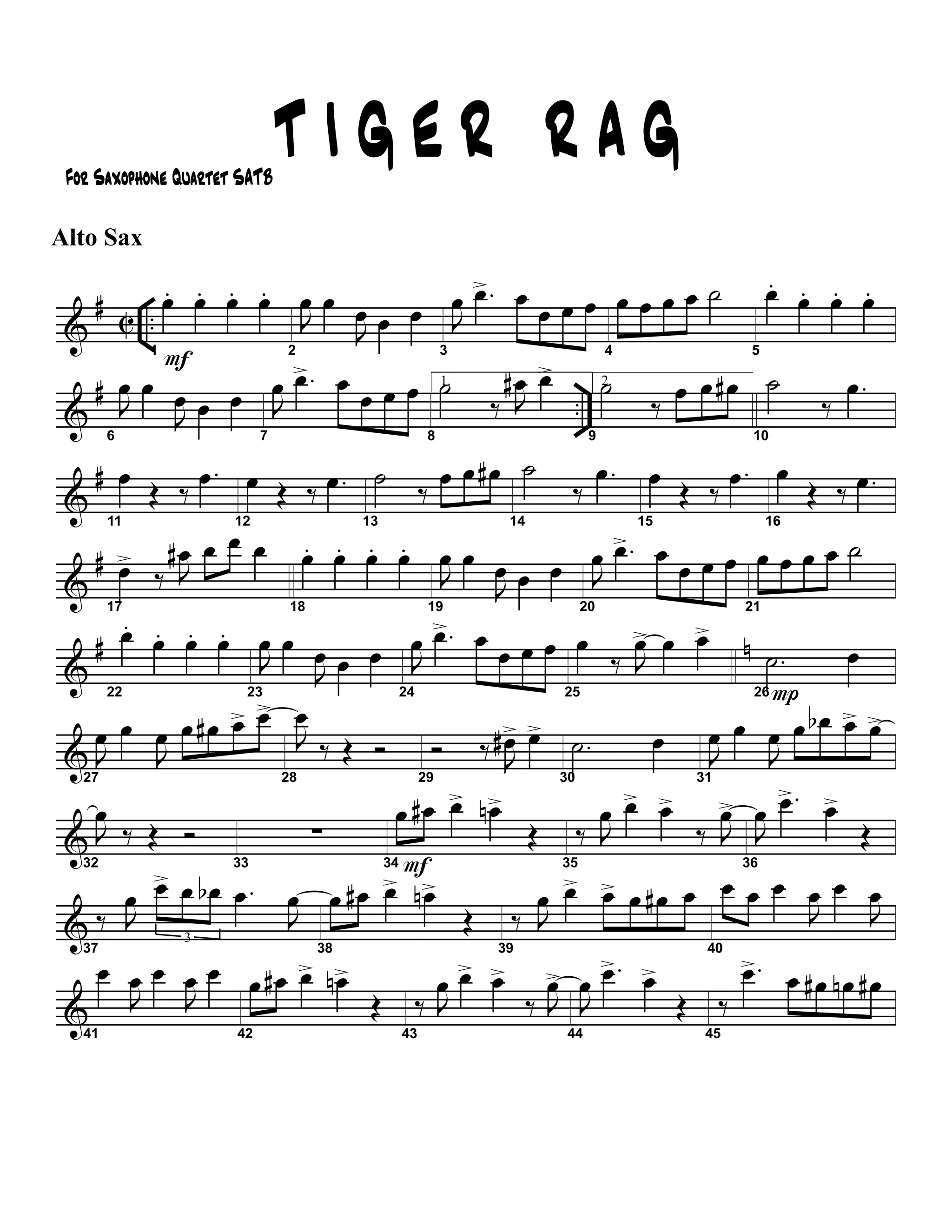 Le document présente une transcription de la pièce 'Tiger Rag' pour un quartet de saxophones, arrangée par Deane Kincaid et transcrite par Bruce A. Evans. Il comprend divers passages musicaux et indications spécifiques pour chaque instrument, détaillant les parties des saxophones soprano, alto, ténor et baryton. Cette œuvre est caractérisée par des motifs rythmiques et mélodiques emblématiques du jazz.