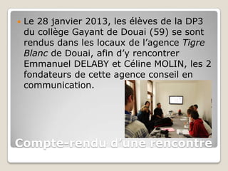 L'agence Tigre Blanc, fondée en 2004 par Emmanuel Delaby et Céline Molin, est spécialisée dans la création de supports de communication et logos, utilisant des outils numériques comme Photoshop. Les deux créateurs partagent leurs parcours professionnels, soulignant l'importance de suivre une passion plutôt que de se concentrer uniquement sur le salaire, et décrivent un environnement de travail convivial et familial. Les élèves ont appris que les chemins professionnels ne sont pas toujours linéaires et qu'il est possible de se réorienter à différents moments de sa carrière.
