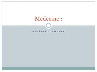 Le document présente divers remèdes naturels et tisanes pour traiter différentes affections, telles que la dépression, le rhume, et l'obésité. Il inclut des mélanges à base de thé, café, et autres ingrédients comme la menthe, le miel, et le gingembre. De plus, il mentionne des remèdes traditionnels pour des maladies graves et des conseils de soins pour la peau et les cheveux.