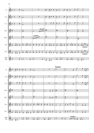 Le document semble être une partition musicale composée par James Horner, qui inclut divers instruments tels que le carillón, le metalófono, et le xilófono. Il présente différentes sections avec des indications pour les interprètes et des annotations musicales. L'œuvre est divisée en thèmes et motifs, offrant une structure harmonique riche.