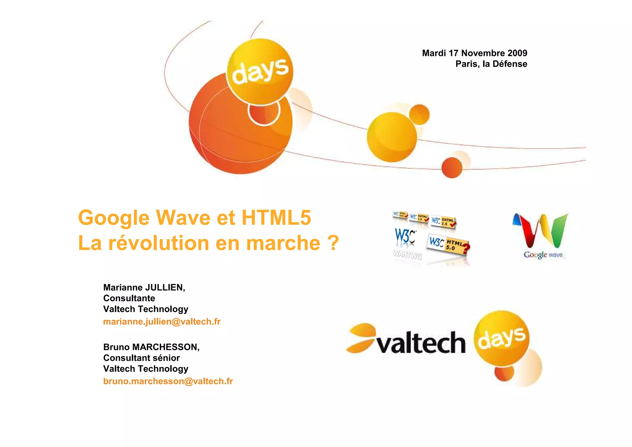 Le document présente une analyse de HTML5 et de Google Wave, soulignant l'évolution du développement web et les fonctionnalités innovantes de ces technologies. HTML5 introduit de nouvelles balises sémantiques, des API JavaScript et un support multimédia amélioré, tandis que Google Wave propose un nouvel outil de communication collaborative alliant email, chat et documents. Les perspectives d'avenir pour ces technologies incluent des améliorations continues des navigateurs et une séparation entre applications web pures et celles basées sur des plugins.