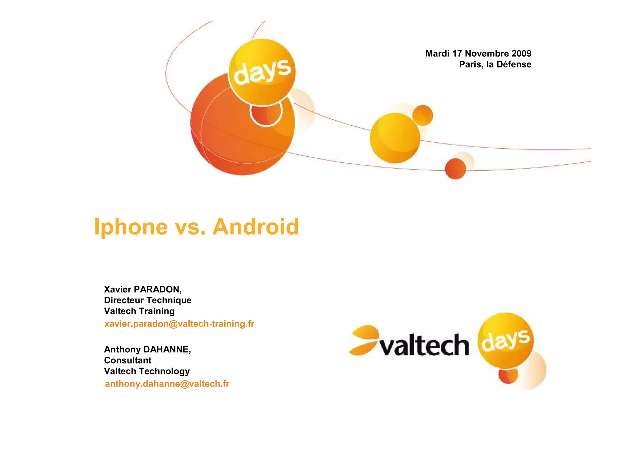 La présentation compare l'iPhone et Android en 2009, mettant en évidence leurs parts de marché, fonctionnalités et environnements de développement. Bien qu'Apple ait pris de l'avance, Android est en pleine expansion avec des perspectives favorables pour les entreprises. Les deux plateformes offrent des fonctionnalités similaires mais avec des stratégies distinctes, Apple ciblant le haut de gamme et Google visant une adoption plus large.