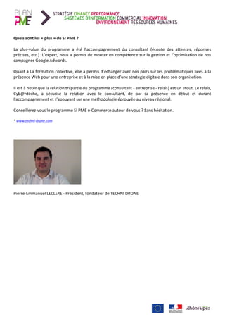 Techni Drone, leader en France des formations de télé-pilote de drones civils avec un chiffre d'affaires entre 400 et 500 k€, a bénéficié d'un programme d'accompagnement pour optimiser sa stratégie de communication numérique. Grâce à cette initiative, l'entreprise a lancé un nouveau site internet et optimisé ses campagnes Google AdWords, réduisant les coûts tout en maintenant leur efficacité. Le soutien d'un consultant et l'échange avec d'autres entreprises ont été des atouts précieux dans leur démarche de digitalisation.