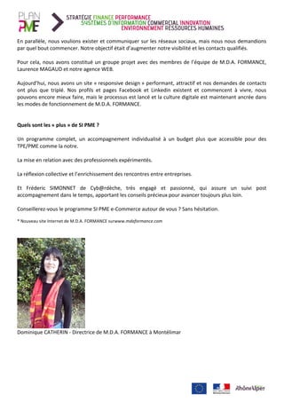 M.D.A. Formance, un centre de formation basé dans la Drôme, a modernisé son site web et renforcé sa présence sur les réseaux sociaux avec l'aide d'une consultante en webmarketing, ce qui a entraîné une augmentation significative des contacts qualifiés. L'entreprise s'est engagée dans une démarche pour acquérir une culture digitale afin de répondre aux besoins des nouvelles générations et améliorer son offre de formation à distance. Le programme SI PME e-commerce a été recommandé pour son accompagnement individualisé et son coût accessible.