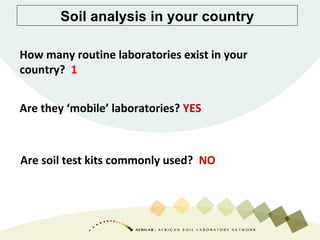 Le laboratoire des sols, eaux, végétaux et engrais au Togo est un laboratoire unique en son genre, équipé d'installations modernes mais nécessitant des améliorations telles qu'une plus grande taille et une automatisation des analyses. Le laboratoire souligne l'importance de l'harmonisation des méthodes d'analyse et de collaboration entre laboratoires pour renforcer leurs capacités techniques. Le présentateur exprime le souhait d'obtenir un soutien vers l'accréditation et des formations continues pour le personnel.