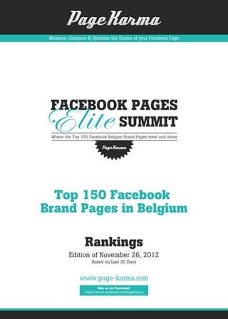 Le document présente un classement des 150 meilleures pages de marques sur Facebook en Belgique, publié le 26 novembre 2012, basé sur les performances des 30 derniers jours. Il décrit également l'utilisation d'un outil appelé Page Karma pour mesurer, comparer et optimiser la performance des pages Facebook, en fournissant des statistiques détaillées et des analyses. Les fonctionnalités incluent des tableaux de bord, des insights par pays et des outils d'optimisation pour maximiser l'engagement des publications.
