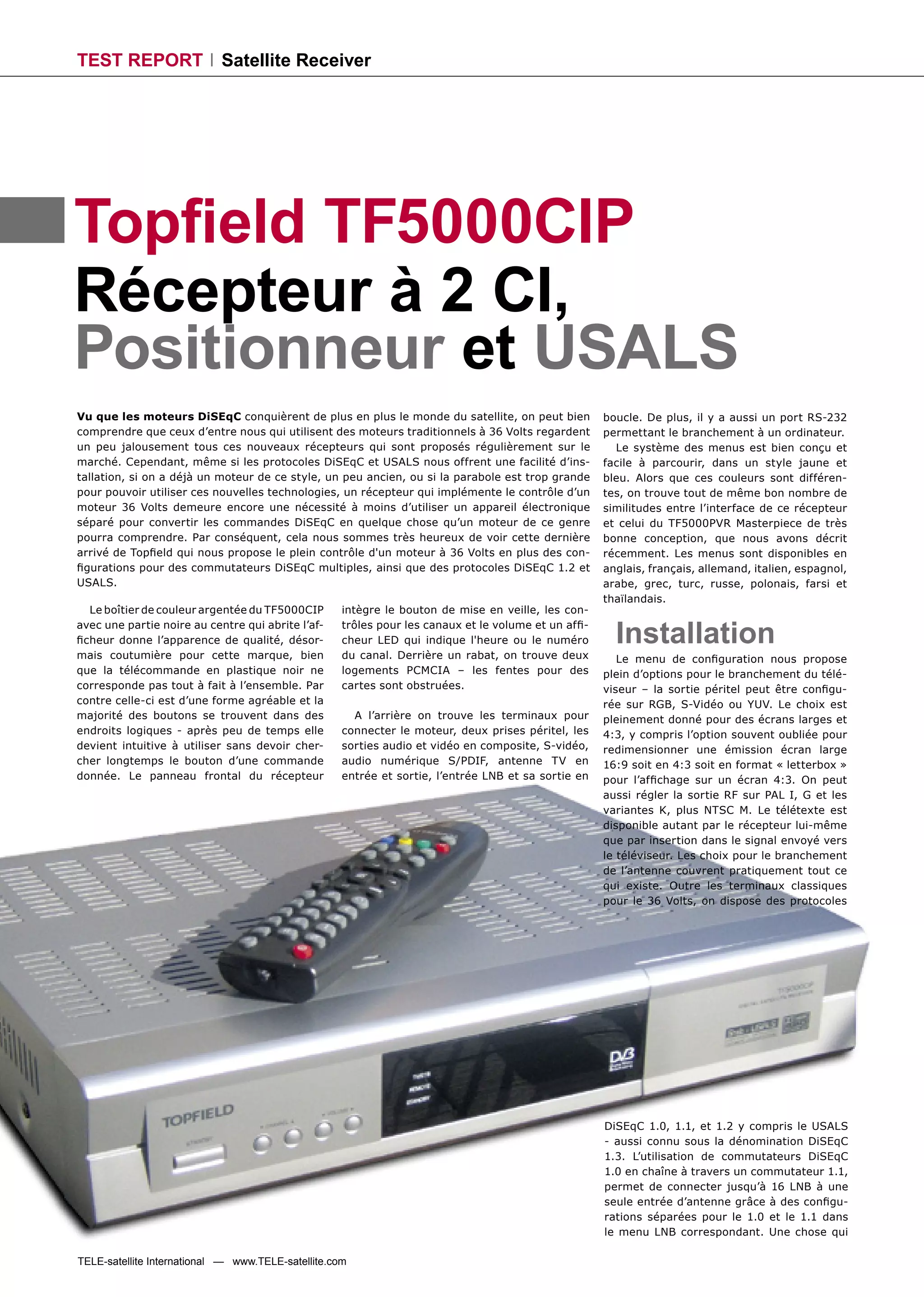 Le rapport de test du récepteur satellite Topfield TF5000CIP met en avant ses fonctionnalités, notamment le contrôle des moteurs 36V et la compatibilité avec les protocoles Diseqc et Usals. Bien que le récepteur offre une interface intuitive et divers ports de connexion, il présente des limitations telles que l'absence de la fonction d'enregistrement et une mémoire de seulement 5000 chaînes. Globalement, il est jugé efficace pour une utilisation quotidienne malgré quelques manques.